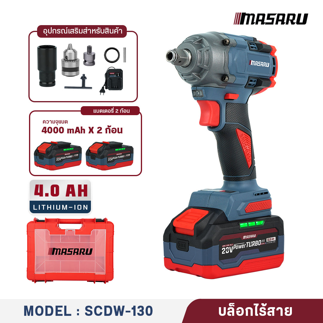 บล็อกไฟฟ้าไร้สาย 20V รุ่น SCDW-130 ใช้แบตเตอรี่ลิเธียมไอออนที่ทนทาน น้ำหนักเบา เหมาะสำหรับงานช่างทั่วไปและอุปกรณ์งานช่างที่ต้องการความคล่องตัว